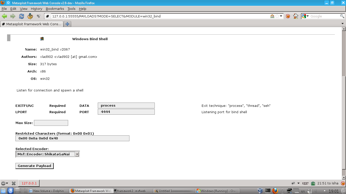 The next step is to create a payload that will be incorporated into the buffer. Later, the buffer will be sent along with the JMP ESP address through the fuzzer.